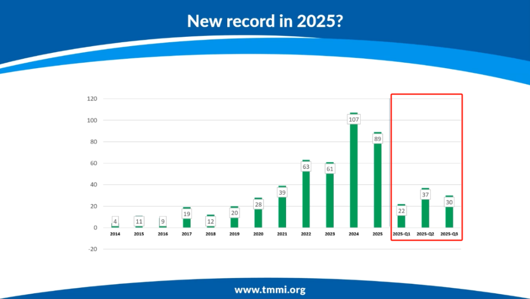 图1:2025TMMi®成员国会议最新公布-全球历年正式评估数量统计(含2025年前三季度数量统计)