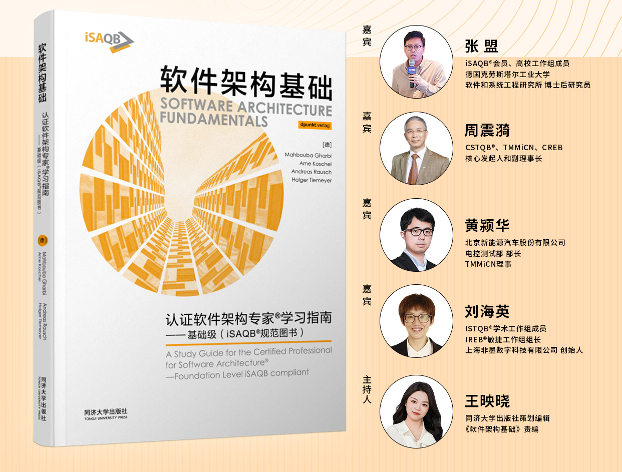 2025年10月16日,《软件架构基础》新书发布会线上直播活动圆满落下帷幕,本次直播由同济大学出版社策划编辑、同时担任《软件架构基础》责任编辑的王映晓女士主持,直播特邀四位软件领域重磅嘉宾云端相聚,共同打造了一场聚焦“软件架构基础理论与落地实践”的专业知识盛宴,为软件行业从业者、高校相关专业师生及架构学习爱好者带来兼具深度与实用性的启发;四位嘉宾均在各自领域深耕多年,兼具理论高度与实践经验,其中包括本书译者——iSAQB®会员、高校工作组成员、德国克劳斯塔尔工业大学软件和系统工程研究所 博士后研究员张盟老师;CSTQB®、TMMiCN、CREB的核心发起人和副理事长周震漪老师;ISTQB®学术工作组成员,IREB®敏捷工作组组长,以及上海非墨数字科技有限公司创始人刘海英老师;以及北京新能源汽车股份有限公司电控测试部部长、TMMiCN 理事黄颍华老师。