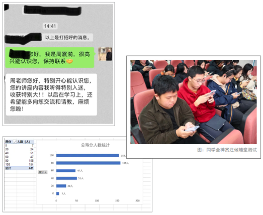 在讲座尾声的随堂测验环节,同学们认真答题并交出了亮眼的答卷:在参与测验的441位同学中,154人获得满分,158人取得80分,两者合计占比超70%;60分及以上合格人数达359人。这份数据不仅印证了同学们的学习热情,更凸显了周老师深入浅出的授课魅力与显著的教学成效。讲座结束后,还有同学主动添加周老师的联系方式,真诚表达对这场精彩讲座的感谢与收获。