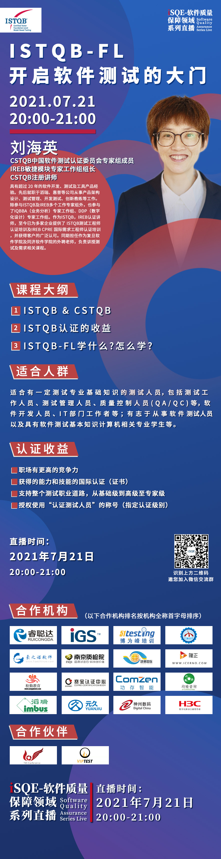 iSQE相关体系直播第三课——《ISTQB-FL,开启软件测试的大门》直播将于7月21日(本周三晚20:00)正式开播。
