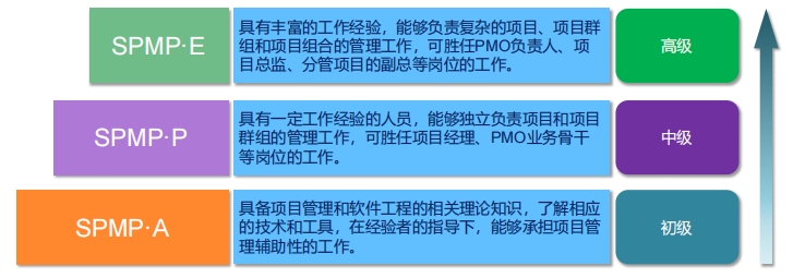 SPMP能力评价根据知识、能力、经验的要求,将软件项目管理专业人士能力级别分为三个级别:SPMP·A(初级)、SPMP·P(中级)、SPMP·E(高级)