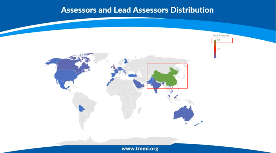 另一组备受关注的数据,是(主任)评估师的资质信息更新:持续拥有资质的时间是2021年第一季度至2025年第三季度,此期间内有效评估资质的人员数共有187个(121名评估员,66名首席评估员);其中中国拥有数量最多(92人)(如图3),包括45名主任评估师和47名评估师。此外,独立评估师数量为86人,包括23名主任评估师和63名评估师;评估师和主任评估师分布在30个国家。中国团队凭借专业能力,为全球TMMi®评估工作提供了重要技术支撑。