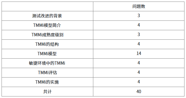 TMMi®专业人员资格考试将以本文档为基础。考题为单选题。考试既可以作为培训课程的一部分,也可以单独进行(例如,在考试中心参加考试或者参加公开考试)。完成培训课程不是参加考试的前提条件。考试总分为40分。每答对一道题得一分。如果是试题是考生的母语,则考试总时间是60分钟。如果考试试题不是考生的母语,则考试总时间为75分钟。至少达到65%正确率(26分及以上)可通过考试。