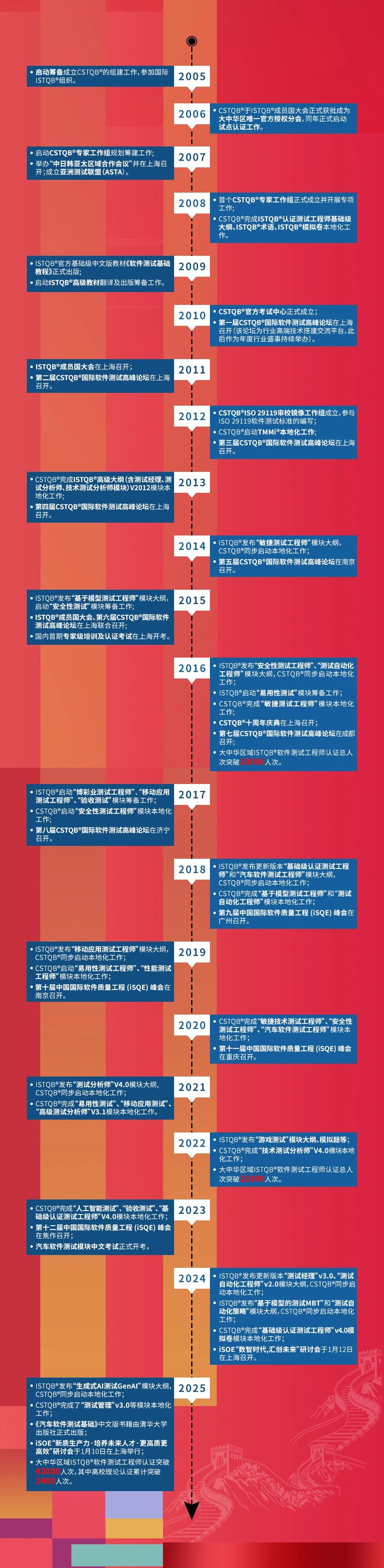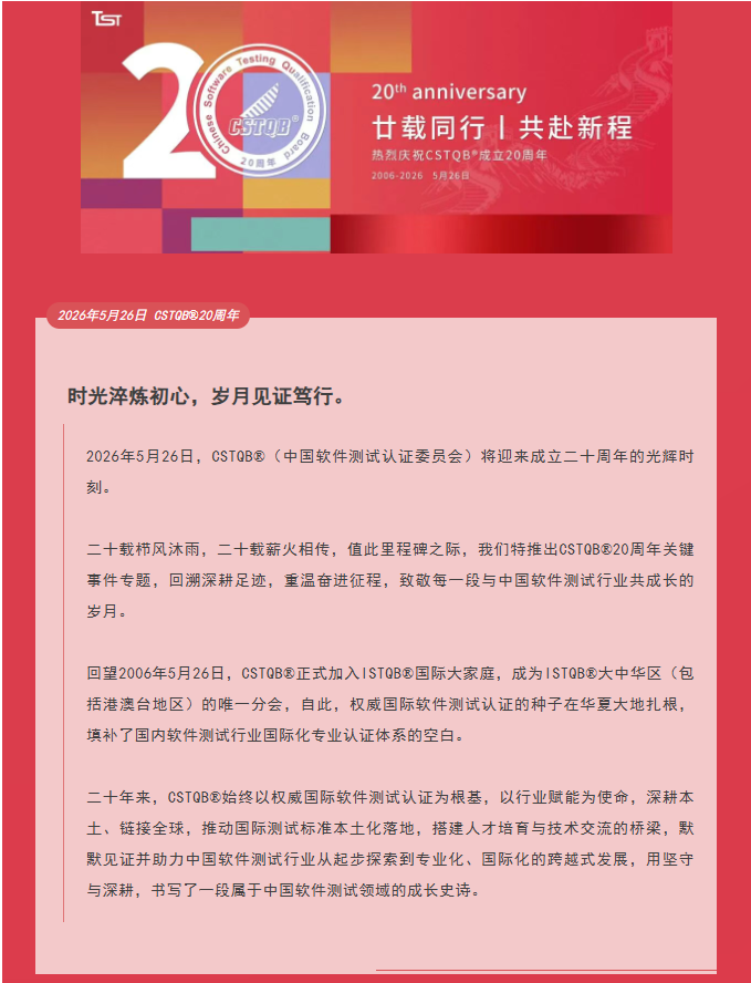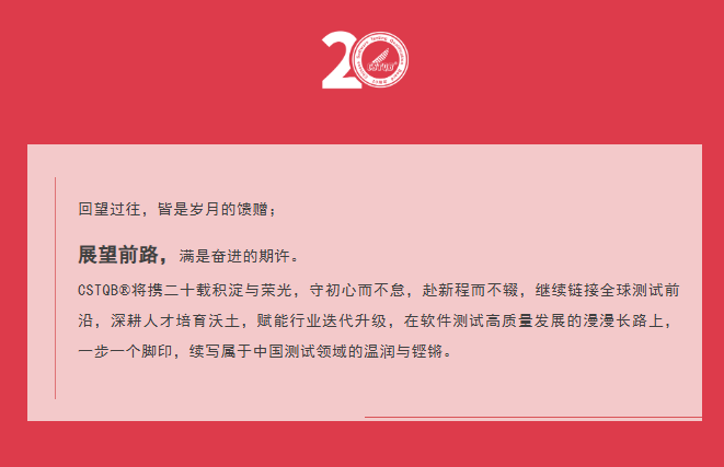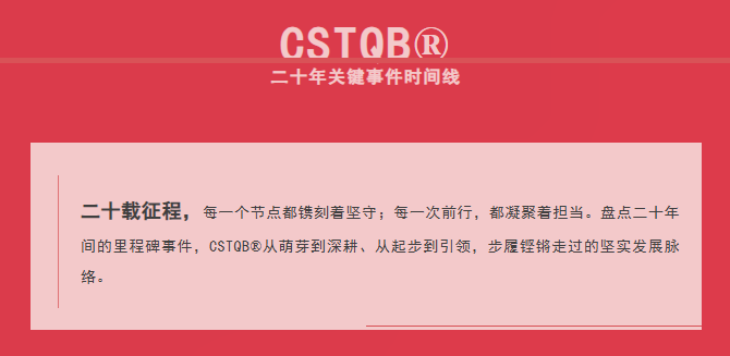 CSTQB®(Chinese Software Testing Qualifications Board)是ISTQB®在大中华区(包括港澳台地区)的唯一分会,始终致力于推动软件测试行业的发展。CSTQB®通过市场调研、信息交流、咨询培训、评估认证、知识产权保护等方面的工作,推动中国软件测试行业的发展,做好为CSTQB®会员的服务工作,面向全行业,发挥政府与企事业单位之间的纽带和桥梁作用,为中国的测试行业提供一个新测试方法、新技术的研究和推广的交流平台,加强国际交流与合作,积极推进国际通用软件培训和认证体系,建成规范的高端培训和认证平台,推动国际软件测试人才流动和技术交流,使中国软件测试行业与国际接轨。未来,CSTQB®将继续秉承ISTQB®的全球化标准和理念,携手区域伙伴助力测试人员职业发展与持续成长。